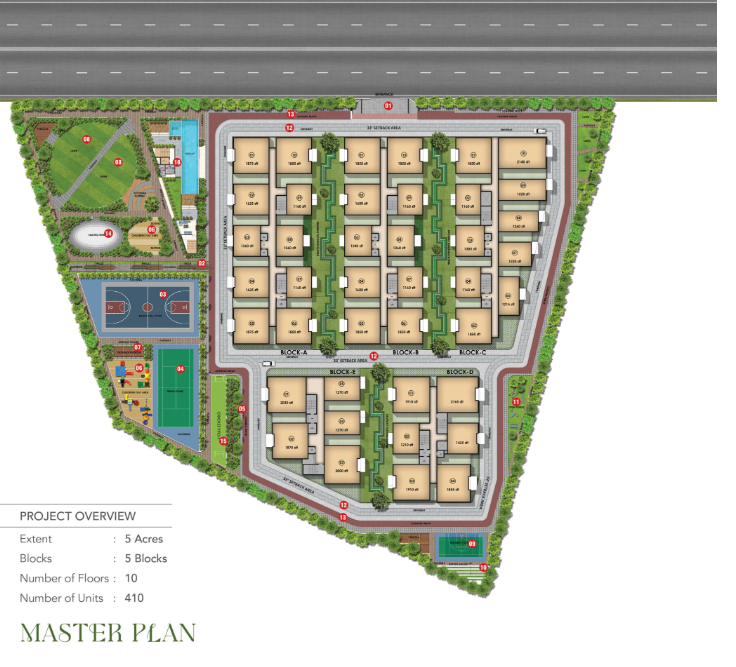 • 5 independent blocks each with Cellar + Stilt + 10 Floors 410 Units of 2 and 3 BHK Premium Residences